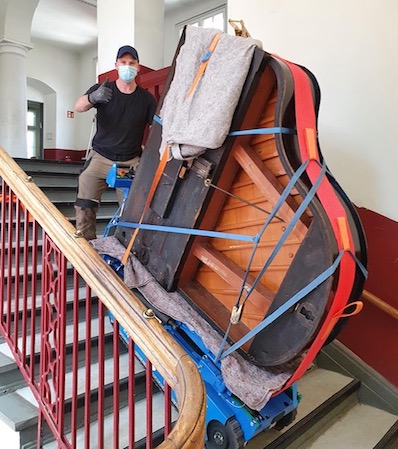 Eingepacktes Klavier – Transport über Treppen im Treppenviertel.