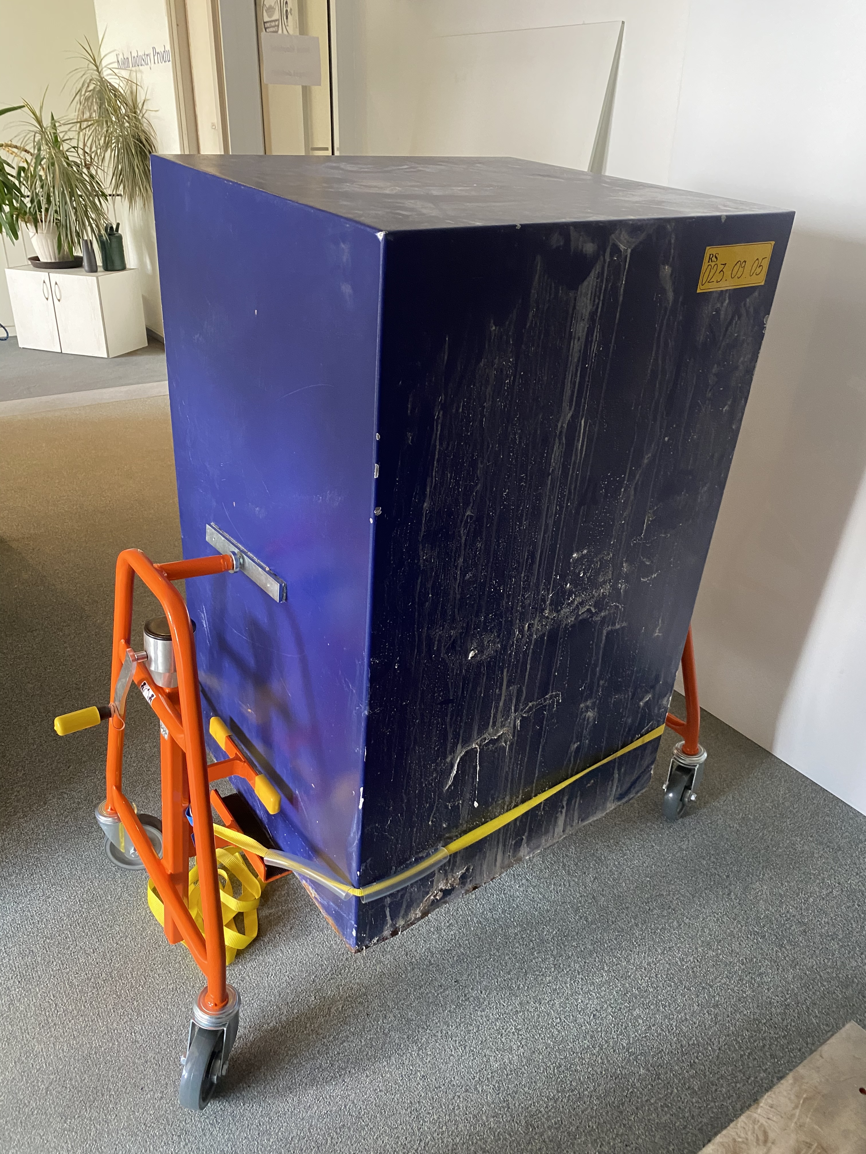 600-kg Schutzschrank – im Kaufhaus abgeladen (Transportschild sichtbar).